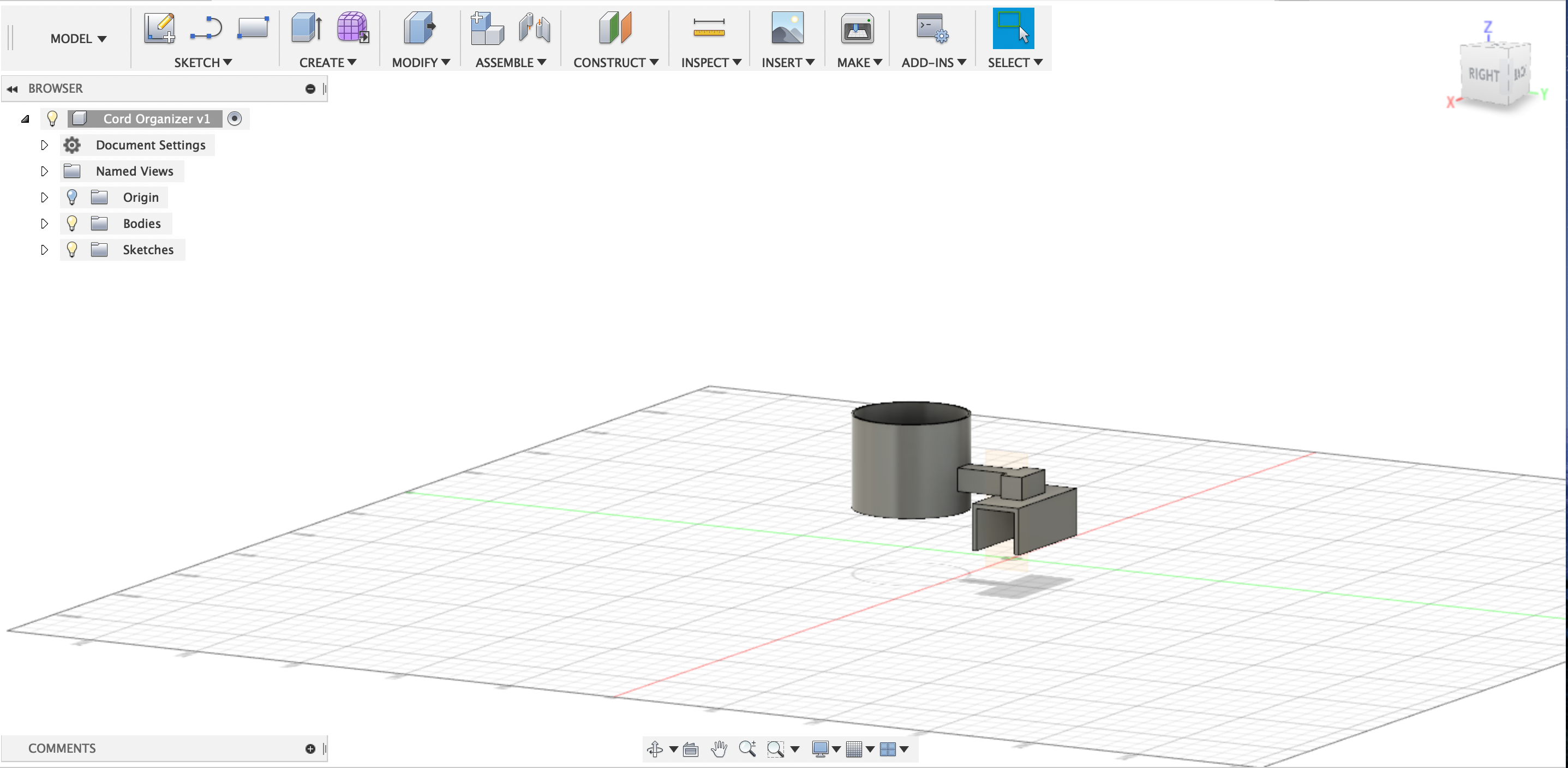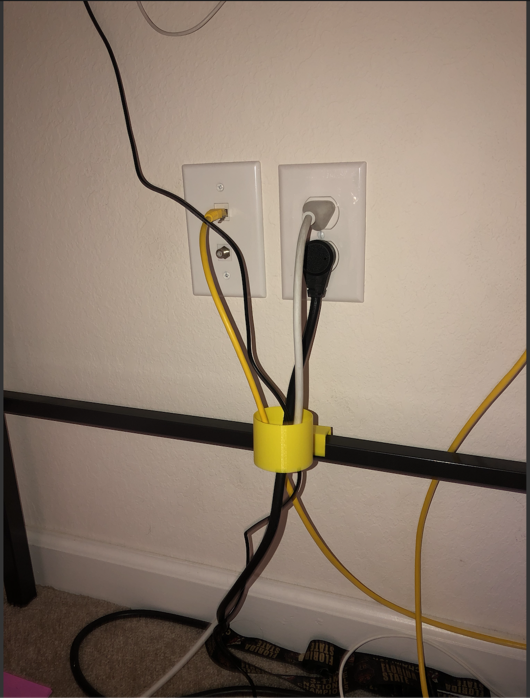 So, when i first heard of this assignment, my mind instantly went to my room in my apartment. Under my desk (where i do a lot of work at) is a good amount of free dangling cords that connect to various things i need and use. Now, i’m a clean individual and like to keep my room tidy. But everyday i walk into my room, i see the ugly cords just hanging there. I was thinking that i could print a cord organizer or something to that nature that can attach to the bottom support beam of the desk (the horizontal beam underneath the cords) that had a decently sized, open cylinder that extended from the beam facing vertically that i can just feed the cords through it. In the end, i hope that the cords would all come into a centralized location and feed up to the desk together. It’ll make my room more organized and clean.